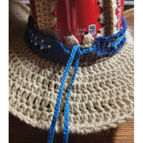This unique hat band is made with pop top tabs and can be used with the cowboy hat. The ends are made with homemade paper beads to top off the style.