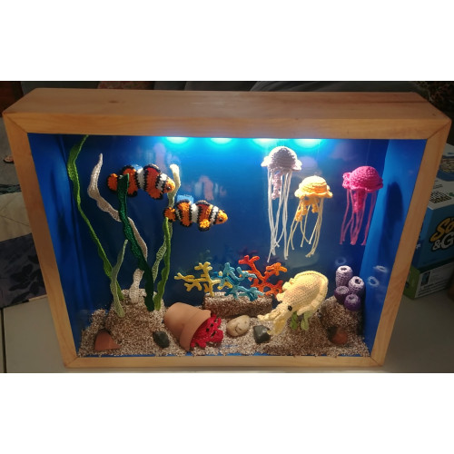 SOLD Measures 15 1/2" x 12 1/2" x 3 1/2". It includes 2 clown fish, 3 Jellyfish, 1 crab, 1 cuttlefish 3 Coral, Cluster of Porifera, 6 pieces of seaweed, 1 battery-operated light